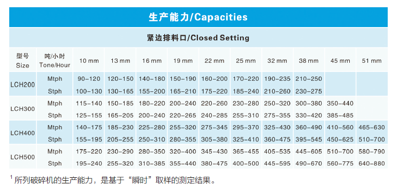 Cone crusher capacity charts are developed for use as an application tool to properly utilize the LCH crusher’s capabilities. The capacity figures shown apply to material weighing 1600kg per cubic meter. The crusher is one component of the circuit. As such, its performance is in part dependent on the proper