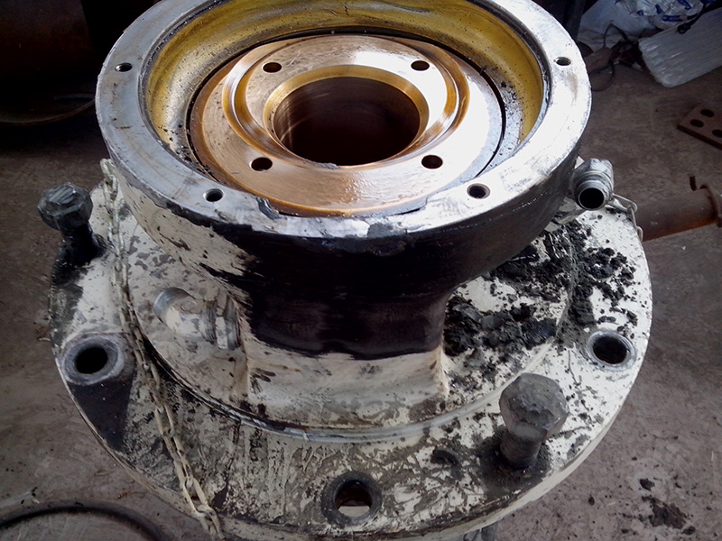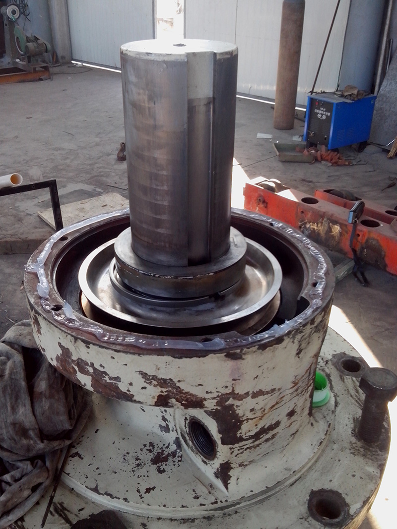 2014-06-09 客戶HP500圓錐破碎機的水平軸殼體因過度磨損不能繼續(xù)使用,運到我公司維修。由我司技術(shù)人員拆解水平軸總成,更換新的水平軸殼體,銅套,護板。